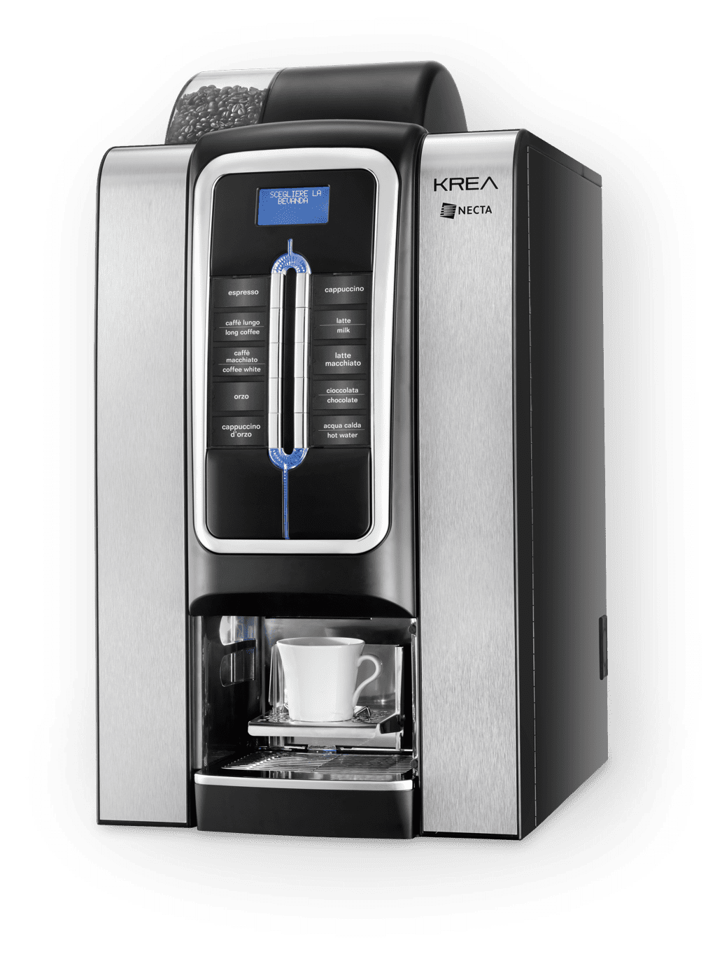 Krea Touch è il nuovo elegante modello che va ad arricchiere la famiglia Necta per il segmento Horeca. Un design accattivante, luci decorative, cornici cromate, superfici nere lucide e performance senza paragoni fanno di Krea Touch la soluzione ideale per la vostra pausa caffè. L’ampio Touch screen e l’interfaccia user friendly permettono di scegliere tra un alto numero di selezioni, di gestire in modo flessibile e personalizzato le ricette, le attività di promozione alle vendite e la trasmissione di video.